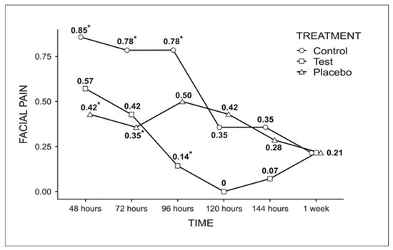 For facial pain (Figure 4), the most notable difference occurred at 96 h, where the test group (0.14) showed a statistically significant reduction compared to the control group (0.78).