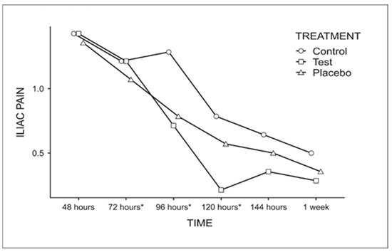 Iliac pain was significantly reduced at 72, 96, and 120 h, regardless of treatment (Figure 5). After this period, no statistically significant difference was observed (0.5 at 144 h and 0.38 at 1 week).