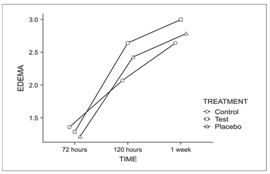 For edema (Figure 6), a longer evaluation period correlated with a greater perception of edema reduction, regardless of treatment.