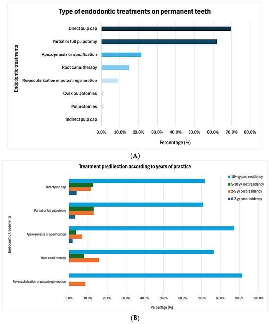 Endodontic procedures are both prevalent and clinically significant in pediatric dentistry, reflecting the high incidence of caries- and trauma-related pulpal pathology in both primary and permanent dentitions [1]. In the primary dentition, the prevalence of pulpitis has been estimated at approximately 1.55 cases per child, with nearly 50% of children requiring endodontic therapy having undergone at least two clinical endodontic procedures [2]. In comparison, endodontic treatment needs affect up to 9.6% of pediatric patients overall, with permanent teeth accounting for nearly 70% of these cases [3,4]. Caries and traumatic dental injuries are the primary reasons for endodontic treatment in permanent teeth, with prevalences of approximately 64% and 33%, respectively [3]. Endodontic treatment in pediatric patients presents unique challenges due to the anatomical and physiological characteristics of developing teeth, the complexities of behavior management, and the technique-sensitive nature of the procedures, which require specialized materials not commonly used in everyday practice. Importantly, endodontic treatment in primary teeth is typically limited to less complex procedures, such as pulpotomy or pulpectomy, often with a focus on maintaining function until exfoliation [1]. In contrast, permanent teeth require more intricate and definitive therapies, such as apexogenesis, apexification, or root canal therapy, to preserve long-term tooth viability [1]. Treating permanent teeth in pediatric patients presents additional difficulties, including anesthetic management, the potential need for multiple visits to complete treatment, and the prolonged procedure duration [3]. In addition, successful management requires an integration of clinical expertise and tailored treatment strategies to address patient anxiety and non-compliance. Pediatric dentists play a critical role in endodontic management, balancing pulp preservation with long-term restorative outcomes. However, clinical practice patterns for the endodontic management of permanent teeth vary among pediatric dentists.