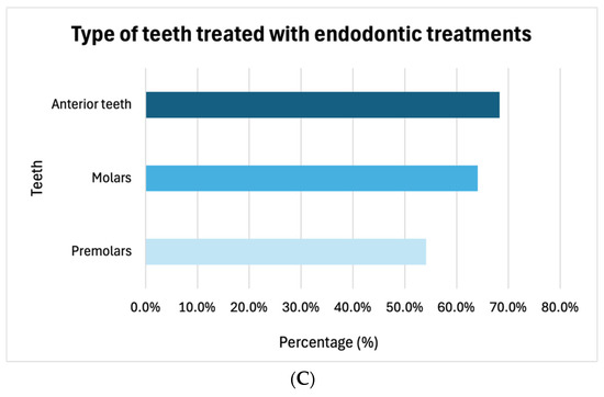 Practice patterns regarding endodontic management: (A) type of endodontic treatments performed, (B) influence of years of experience, and (C) type of teeth.