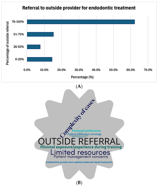 Practice patterns regarding referral of endodontic management of permanent teeth: (A) frequency of referral to outside providers and (B) word cloud depicting the reasons for referral to outside providers. The size of each word reflects its frequency, with larger statements being more often reported by the respondents. This thematic analysis derives from the responses to the item “What are the main reasons for referring pediatric endodontic cases involving permanent dentition out of your practice?”.