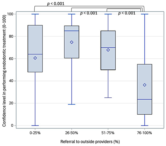 Influence of self-perceived confidence levels on percentage of referrals of endodontic management of permanent teeth to outside providers.