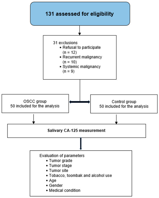 The total sample size consisted of 100 participants, with 50 patients diagnosed with OSCC and 50 matched healthy controls.