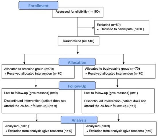 - Sancho-Puchades, M.; Vílchez-Pérez, M.Á.; Valmaseda-Castellón, E.; Paredes-García, J.; Berini-Aytés, L.; Gay-Escoda, C. Bupivacaine 0.5% versus articaine 4% for the removal of lower third molars. A crossover randomized controlled trial. Med. Oral. Patol. Oral. Cir. Bucal. 2012, 17, e462–e468. [Google Scholar] [CrossRef] [PubMed][Green Version]