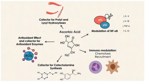 Vitamin C, a potent antioxidant, cannot be synthesized by the human body due to the absence of the enzyme L-gulono-gamma-lactone oxidase [9,10,11], making it an essential nutrient that must be obtained through diet. Vitamin C serves multiple critical functions, including its essential role in collagen synthesis and stabilizing its tertiary structure, which is crucial for maintaining the integrity of connective tissues, such as the periodontium [12,13]. Additionally, ascorbate is vital for the biosynthesis of catecholamines (dopamine, norepinephrine, and epinephrine), acting as a cofactor for dopamine β-hydroxylase, thereby supporting the synthesis of dopamine and norepinephrine. During sepsis, β-adrenergic receptor downregulation and impaired adrenal hormone synthesis are observed, while ascorbate deficiency reduces norepinephrine levels, particularly in the adrenal glands. Ascorbate also enhances adrenergic receptor activity, and the brain and adrenal glands are the tissues with the highest ascorbate concentrations, emphasizing its crucial role in catecholamine function. Supplementing ascorbate during sepsis may aid in catecholamine synthesis and receptor activation [14].