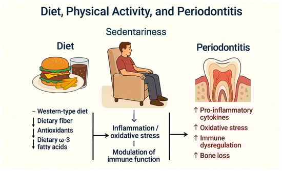 Interrelationship between Western-type diet, sedentary lifestyle, and periodontitis. A Western-type diet, typically low in dietary fiber, antioxidants, and omega-3 fatty acids, combined with a sedentary lifestyle, contributes to increased systemic inflammation and oxidative stress. These conditions impair immune regulation, facilitating the development and progression of periodontitis.