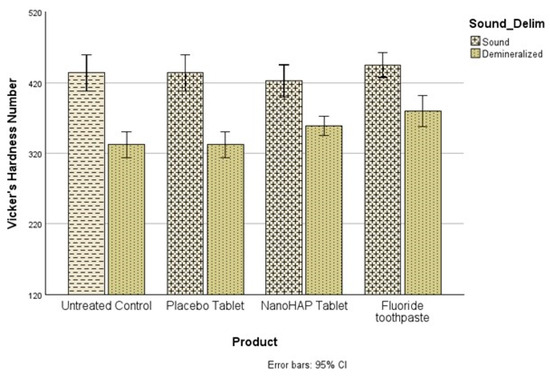 The pH of the dentifrice slurries measured before treatments were NanoHAP dentifrice 7.02 ± 0.10, Fluoride dentifrice 6.88 ± 0.03 and Placebo dentifrice 7.04 ± 0.05. For the demineralization data, three separate analyses were conducted using SPSS version 28 to address the three objectives of this study. The first objective was to determine whether there were significant differences in Vicker’s hardness number (VHN) between the sound and demineralized teeth (Demineralization). The comparisons were made within each of the four experimental groups, and using paired samples t-test, VHN was found to differ significantly (p < 0.001) between sound and demineralized teeth within all groups (Figure 1). All paired comparisons had large effect sizes (Cohen’s d), 4.24 (untreated control), 2.38 (Placebo tablet), 1.21 (NanoHAP tablet) and 1.29 (Fluoride toothpaste).