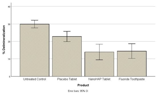 The second objective was to compare the percentage demineralization for each of the four experimental groups. For this purpose, the ANOVA was conducted to determine whether statistically significant differences occurred. A statistically significant difference in percentage demineralization among the four groups was observed at the alpha level of 0.05, F(3, 104) = 19.07, p < 0.001 (Figure 2). A posthoc analysis showed that the Untreated Control (29.93 ± 5.58) had a higher percentage demineralization than the Placebo tablet (22.81 ± 7.47), NanoHAP tablet (13.93 ± 11.31) and Fluoride toothpaste (14.44 ± 10.65). The differences were statistically significant at the alpha level of 0.05. Placebo tablet had a statistically significant higher percentage demineralization than NanoHAP tablet and Fluoride toothpaste. There was no significant difference between the NanoHAP tablet and the Fluoride toothpaste.