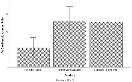 The last analysis focused on comparing the dentifrices based on their percentage demineralization inhibition. A one-way variance analysis was used, and it was observed that a statistically significant difference in percentage demineralization inhibition exists among the three groups F(2, 78) = 6.06, p = 0.004, at the alpha level of 0.05 (Figure 3). Tukey test was conducted to compare the percent demineralization inhibition for each pair of the products for significance. NanoHAP tablet (51.74 ± 40.05) and Fluoride toothpaste (50.56 ± 37.21) had statistically significant higher percent demineralization inhibition than Placebo tablet (21.86 ± 5.55), at the alpha level of 0.05. There was no statistically significant difference between NanoHAP tablet and Fluoride toothpaste regarding percent demineralization inhibition.