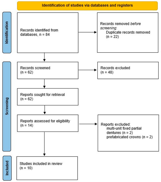Ten articles were included for appraisal, as outlined in the PRISMA flow diagram (Figure 1), involving the marginal gaps of 180 crowns. Six studies evaluated the marginal gaps of cobalt–chromium alloy crowns (97.17 ± 55.73 µm) [38,39,40,41,42,43], which was the material used in all included studies published within the past 10 years. Earlier studies (prior to 2014) documented assessments of AMCs fabricated with titanium (55.85 ± 30.57 µm) [44,45], noble metals (127 µm) [46], and base metal alloys (35 µm) [47]. Computer-aided design–computer-aided manufacturing (CAD-CAM) was the most used AMC fabrication method, followed by lost wax casting and laser sintering. The findings have been summarised in Table 1. A critical appraisal (Table 2) revealed that five of the ten articles [38,39,40,45,46] did not fully address all of the identified confounding factors that could have influenced the measurement of the marginal gap. An important consideration is the inconsistency in the underlying materials of the dies used to fabricate the crowns, which introduces a significant risk of variation and bias, thereby impacting the overall certainty of the evidence.