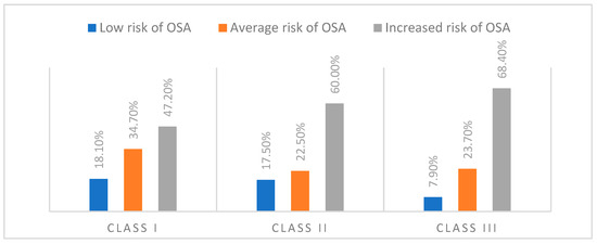 The distribution of subjects by the obstructive sleep apnea (OSA) risk and the dento-maxillary anomaly (ADM) class, based on the STOP-Bang scores, showed a trend toward an increased OSA risk for classes II and III. Among those with class I ADM, 18.1% had a low risk, 34.7% had a medium risk, and 47.2% had a high risk. In class II, the proportion with a high risk rose to 60%, while low-risk cases decreased to 17.5%. In class III, a high risk was observed for 68.4% of the participants, with only 7.9% classified as low-risk (Figure 1).