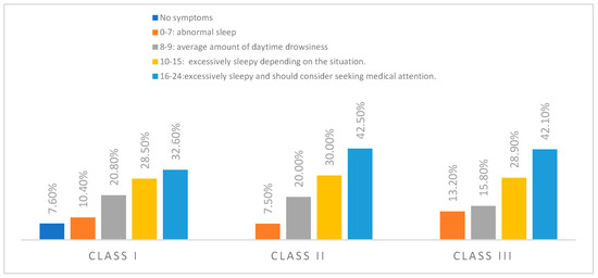 An analysis of the distribution of daytime sleepiness across dento-maxillary anomaly (ADM) classes suggests a trend toward increased symptom severity with more advanced anomalies. The proportion of subjects reporting moderate sleepiness (scores 8–9) remained relatively stable across classes, ranging from 15.8% for class III to 20.8% for class I. Similarly, the percentage of those with low sleepiness (scores 0–7) was consistent across groups, with a slight increase observed for class III (13.2%) (Figure 2).