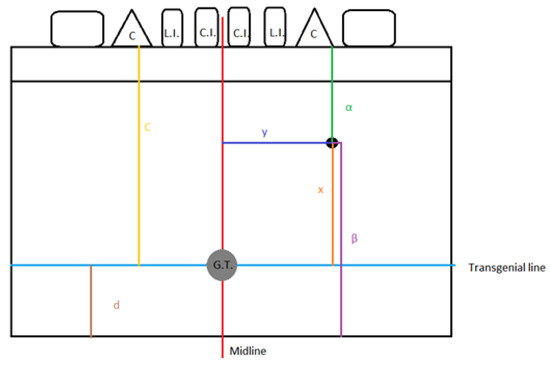 Each distance was measured from the center of each lingual foramen. The location of each lingual foramen was determined using two imaginary lines (horizontal and vertical) intersecting at the genial tubercle, dividing the area into four quadrants: anterior superior, posterior superior, anterior inferior, and posterior inferior. In detail, to determine the position of each foramen, the following distances were measured: (i) Height, namely, the vertical distance between the genial tubercle and the foramen (x); (ii) Length, namely, the horizontal distance between the genial tubercle and the foramen (y); (iii) Radius, namely, the distance between the genial tubercle and the foramen (represented by the square root of x2 + y2); (iv) Distance from the foramen to the alveolar ridge/superior border (α); and (v) Distance from the foramen to the inferior border (β). Similarly, to determine the position of the genial tubercle on the posterior surface of the mandible, the following measurements were taken: (v) Distance from the genial tubercle to the alveolar ridge/superior border (c); Distance from the genial tubercle to the inferior border (d) (Figure 1).