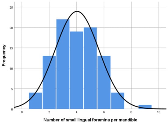 Histogram depicting the number of lingual foramina per mandible in the study sample; the y-axis represents count.
