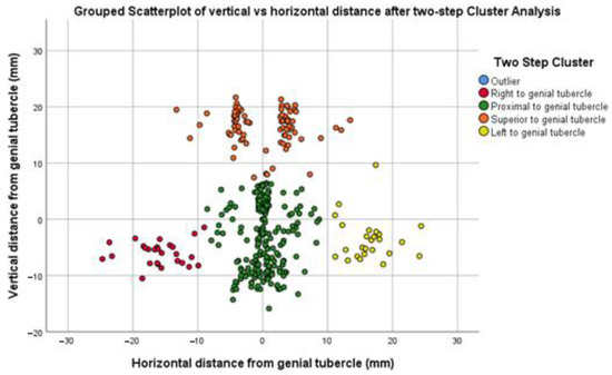 For that purpose, a grouped scattergram depicting the vertical vs. horizontal distance of small lingual foramina from the genial tubercle is provided as Figure 7. This scattergram visualizes the results of a two-step cluster analysis, showing four distinct groups of data points corresponding to the 387 small lingual foramina recorded: (i) right ofthe genial tubercle (from now on called R-LLF), (ii) proximal to the genial tubercle (from now on called P-MLF), (iii) superior to the genial tubercle (S-MLF), and (iv) left ofgenial tubercle (from now on called L-LLF).