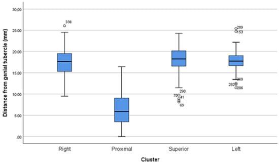 In detail, the characteristics of small lingual foramina per cluster are shown in Table 3. The small lingual foramina of the superior cluster are significantly larger when compared with the foramina of the right (p = 0.008), proximal (p< 0.001), and left (p = 0.022) clusters.