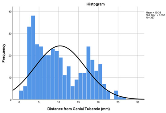 Histogram depicting bimodal distribution of foramen distances from genial tubercle; the y-axis represents count.