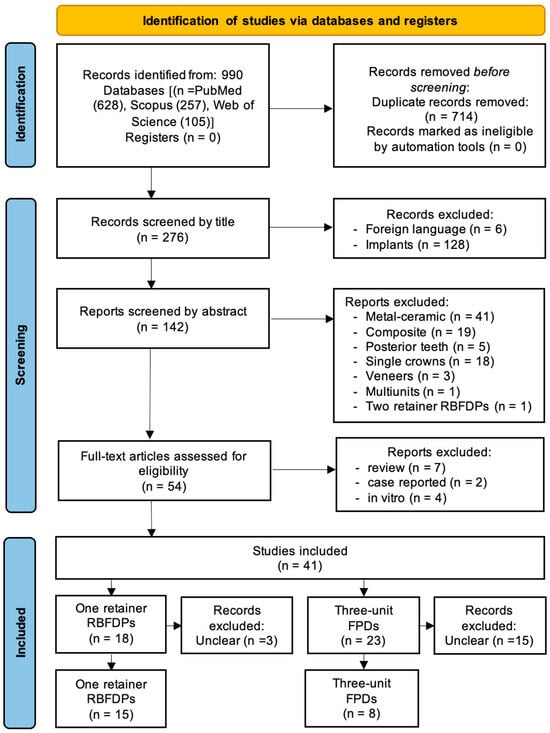 This review follows the newest updated guideline of the Preferred Reporting Items for Systematic Reviews (PRISMA) 2020 statement []. This review was designed according to the updated PRISMA 2020 protocol checklist (available as Supplementary Materials). The literature on RBFDPs and three-unit FPDs was systematically reviewed, and studies were selected following the workflow stages shown in Figure 1.