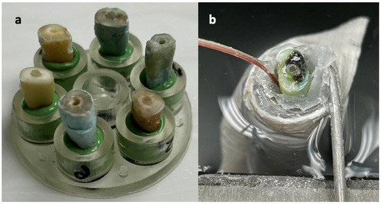 Teeth were secured in a water bath (Thermo Fisher Scientific, Waltham, MA, USA) maintained at 37 °C throughout the study. A temperature probe (Omega Engineering, Stamford, CT, USA) was affixed to the sample at the mid-root level with rope wax (Hanau, Germany) and connected to a 0.04% accuracy digital thermometer (Omega Engineering, Stamford, CT, USA) (Figure 1b).