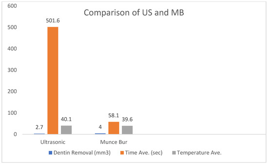 Comparison of US and MB groups regarding dentin removal, US 2.7 mm3, MB 4.0 mm3 (p > 0.05), Average time for removal US 501.6 s, MB 58.1 s (p < 0.001), Average maximum temperature US 40.1, MB 39.6 (p > 0.05).