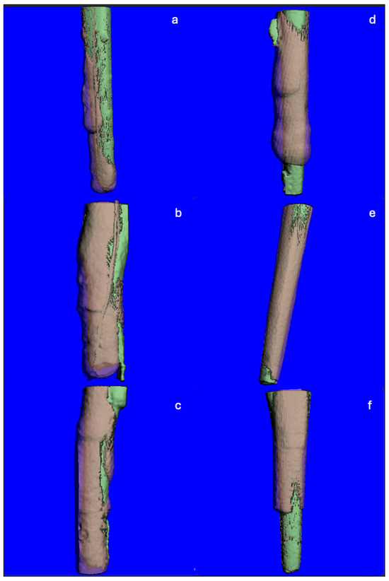 TIF images created from ScanCo Software v4.2. Superimposed micro-CT slices showing the pre- (green) and post- (pink) instrumentation root canal spaces. (a–c) Representative images from the MB group, showing dentin removal biased to one side of the canal. (d–f) Representative images from the US group, showing concentric dentin removal maintained within the center of the canal.