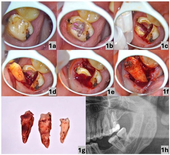 Under infiltration anaesthesia comprising 1.7 mL of an articaine hydrochloride solution with adrenaline in a ratio of 1:100,000 (Septanest Forte, by Septodont, Saint-Maur-des-Fossés, France), we chose to separate the roots prior to their elevation. Both of these procedures were performed using an operating CJ-Optik Flexion Twin microscope (CJ-Optik GmbH & Co. KG, Asslar-Werdorf, Germany) due to the increased risk of a tooth fracture during the extraction. The procedure included the identification of the entrances to the root canals (Figure 1b), the separation of the roots (Figure 1c), and the subsequent elevation of the distobuccal, mesiobuccal, and palatal roots in the indicated order (Figure 1d–g) while a thorough debridement of the alveolar socket was performed. The performed Valsalva manoeuvre was negative, and due to the minimal trauma of the surrounding tissues, there was no need to suture the extraction wound. The patient was clinically re-evaluated 8 days postoperatively to assess soft tissue healing and to rule out complications such as dry socket or infection. A subsequent follow-up was conducted approximately 5 weeks after the procedure to confirm complete mucosal healing. Since no complications were observed, further radiographic follow-up was deemed unnecessary at that moment. Wound healing was considered uneventful, with no need for antibiotic therapy or the prolonged use of analgesics.