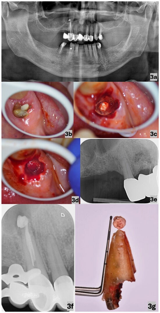 Upon examination, the patient indicated the absence of subjective complaints, without the presence of a clinically significant personal, medicinal, or allergic history. Objectively, only the percussion sensitivity of the tooth was detected in the absence of other relevant symptoms, and the substandard quality of the endodontic treatment was shown on a panoramic radiograph and a perioperative periapical radiograph, with the significant extrusion of obturation materials (Figure 3a,f).