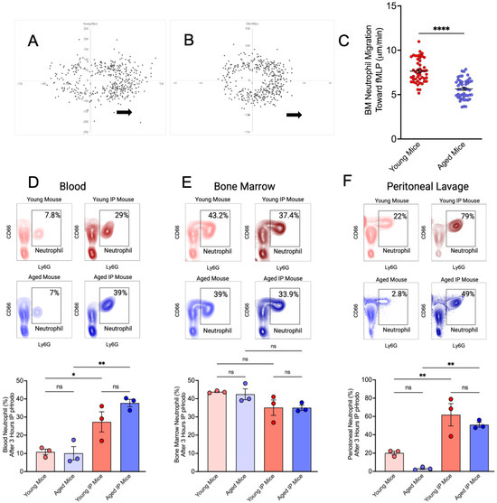 Young and aged murine neutrophil translocation in vitro and vivo. Percoll gradient centrifugation was performed, and bone marrow (BM) neutrophils were recovered. Neutrophil Chemotaxis toward fMLP was determined using a Zigmond chamber. (A,B) XY-plots represent the endpoints of migrating neutrophils with respect to the origin. Arrows indicate the fMLP gradient. (C) Young mice BM neutrophils migrate faster than aged mice neutrophils, each dot representing a neutrophil (Mean ± SEM N = 48). p-values were determined by a 2-tailed paired Student t-test. **** p ≤ 0.0001. (D–F) After 3 h of peritoneal injection of 2 µL of pHrodo Red Escherichia coli BioParticles (Molecular Probes) of mice, peritoneal lavage was recovered, heart blood was collected, and BM was flushed. All samples were fixed. After RBC lysis, all samples were counted and labeled for flow cytometry. The neutrophil number for each sample was obtained by the total counted cell number multiplied the % of gated neutrophil number from flow cytometry (Mean ± SEM N = 3). p-values were determined by ANOVA with Bonferroni’s Multiple Comparison Test * p ≤ 0.05, ** p ≤ 0.01, ns = not significant.