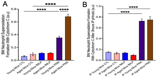 Neutrophil Superoxide Formation with Cytochrome C. Percoll gradient centrifugation was performed, and bone marrow (BM) neutrophils were recovered (A) in a rest situation, aged mice BM neutrophils generated higher superoxide than the young mice after stimulation with 0.1 µM PMA for 30 min. PMA induced higher superoxide formation in neutrophils than the control, and fMLP stimulated neutrophils in both young and aged mice. (Mean ± SEM N = 3) (B) After 3 hours’ induction of peritonitis with 50 µL pHrodo, there was no significant difference in superoxide production between young and aged mice neutrophils with the stimulation of PMA, but the ROS production of neutrophils was higher than their own control or fMLP stimulation (Mean ± SEM N = 3) p-values were determined by ANOVA with Bonferroni’s Multiple Comparison Test **** p < 0.0001. a.u: absorbance units. ROS: Reactive oxygen species. Each experiment result was from 1 million of neutrophils.