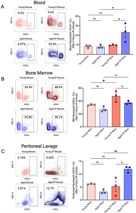 NETosis marker Histone3 Cit Expression in Neutrophils. After 3 h of peritonitis induction of mice with 2 µL pHrodo peritoneal injection, heart blood was collected, peritoneal lavage was recovered, and BM was flushed. After fixation of samples and lysis of RBC for blood samples, labeled H3Cit (AF488) for flow cytometry; (A) Representative flow cytometry plots showing H3Cit+ neutrophils in blood from young and aged mice, either untreated or injected with pHrodo: IP. Quantification shows a significant increase in NETosis (H3Cit+ cells) in aged IP mice. (B) Bone marrow neutrophils from the same groups, showing increased NETosis in young IP mice compared to young mice. (C) Peritoneal lavage neutrophils show increased H3Cit+ expression in aged IP mice, indicating enhanced local NETosis following stimulation. (Mean ± SEM N = 3); p-values were determined by ANOVA with Bonferroni’s Multiple Comparison Test * p < 0.05, ** p < 0.01, ns = not significant.