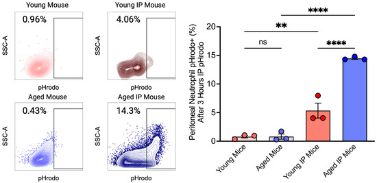 To investigate potential age-related differences in neutrophil phagocytosis in response to acute inflammation, we analyzed phagocytic neutrophils recovered from peritoneal lavage three hours after pHrodo administration of 3 mice per group. Flow cytometry analysis revealed that aged IP mice exhibited a significantly higher percentage of phagocytic neutrophils compared with both aged mice and young IP mice. Although an increase in phagocytic activity was observed in young IP mice compared with young mice, the significantly higher activity in aged IP mice relative to young IP mice suggests enhanced phagocytic capacity in aged mice (Figure 4).