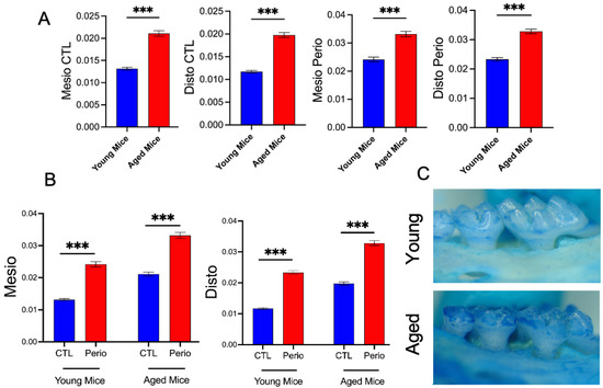 Mesiobuccal and Distobuccal Bone Loss. After ligature placement for 7 days, Maxillae were harvested and fixed with 10% formaldehyde. Dry skulls were stained with methylene blue (1% in water) for 1 min. Images of the buccal aspects of second molars were taken in X5 magnification using a video camera (PixeLINK, Ottawa, ON, Canada) mounted onto a stereomicroscope (Nikon Eclipse E1000). Mesiobuccal and Distobuccal alveolar bone loss was measured by morphometry from the cemento-enamel junction to the alveolar bone crest with ImageJ software. (A) Quantification of bone loss at the mesial and distal sites of molars in control and ligature-induced periodontitis (Perio) models in young and aged mice. Aged mice exhibit significantly greater alveolar bone loss in both control and periodontal conditions. (B) Comparison of mesial and distal bone loss between control (CTL) and periodontal conditions in both age groups confirms that aged mice experience more severe bone loss upon periodontal challenge. (C) Representative images of alveolar bone stained with methylene blue from young and aged mice, illustrating more pronounced bone resorption in aged samples. (Mean ± SEM N = 8), p-values were determined by ANOVA with Bonferroni’s Multiple Comparison Test *** p < 0.001.