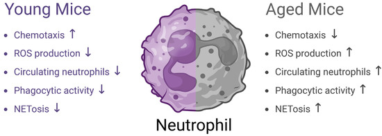 The aging process is accompanied by a broad decline in immune function, a phenomenon known as immunosenescence [8], which affects both the innate and adaptive immune systems. Immunosenescence can lead to weakened immune surveillance [9], making aged people more vulnerable to infections, chronic inflammation, and various age-related diseases [10,11]. With age, immune cells, including neutrophils, undergo changes that alter their typical responses to infections and inflammatory signals [12,13]. In aged individuals, we observe a phenomenon known as inflamm-aging [14], marked by high levels of circulating pro-inflammatory cytokines in the absence of infection, combined with a slower, less effective immune response [15,16]. This change disrupts the immune homeostasis, contributing to poor outcomes in older individuals following infections [17,18].