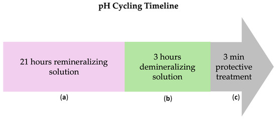 Subsequently, all working surfaces (either untreated or treated with β-TCP-F or CPP-ACP) were subjected to daily in vitro pH cycles, alternating demineralizing (pH = 4.4, for 21 h) and remineralizing (pH = 7, for 3 h) solutions, to mimic the in vivo oral conditions (Figure 1). These cycles were performed daily for 5, 10, and 15 days using fresh pH solutions. At each measurement time (5, 10, and 15 days), 10 surfaces of each group were randomly chosen and immersed in deionized water at 37 °C, and their surface properties and susceptibility to biofilm formation were studied. Five days is equivalent to 1.2 months of remineralization treatment, 10 days to 2.5 months of remineralization treatment, and 15 days to 3.8 months of remineralization treatment. Considering this, a once-a-week application of the remineralization treatment can be used in cases of severe demineralization [27,28].