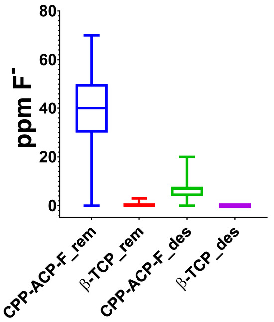 The cumulative concentration of fluoride ions (ppm) in the mineralizing and demineralizing solutions used over the 15 days of cycling pH to which the different human enamel experimental surfaces were subjected are shown in Figure 3. It can be observed that remineralizing and demineralizing solutions used for the samples treated with β-TCP-F contained a higher amount of fluoride ions compared to the solutions used for the CPP-ACP-F-treated surfaces; the remineralizing solutions (pH = 7, 21 h of surface immersion) contained a higher fluoride ions concentration compared to the demineralizing solutions (pH = 4.4, 3 h of surfaces immersion).