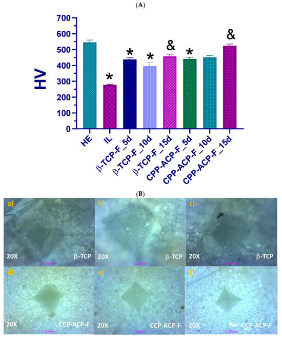(A) Vickers hardness measurements on the enamel surfaces of each group. *: p < 0.05, any surface vs. healthy dental enamel (Group I: HE; positive control). &: p < 0.05, any surface vs. demineralized dental enamel (Group II: IL; negative control). (B) Representative images of the surfaces after the hardness test; surfaces treated with β-TCP-F for (a) 5 days, (b) 10 days, and (c) 15 days; and surfaces treated with CPP-ACP-F for (d) 5 days, (e) 10 days, and (f) 15 days.
