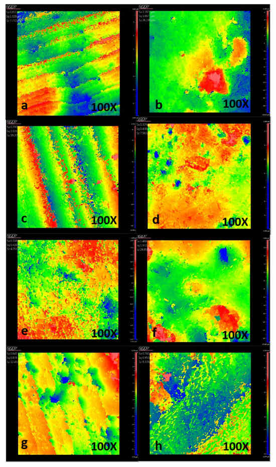 Representative profilometry images of each experimental group: (a) healthy enamel (HE); (b) initial lesion (IL); (c) CPP-ACP-F, 5-day treatment; (d) CPP-ACP-F, 10-day treatment; (e) CPP-ACP-F, 15-day treatment; (f) β-TCP-F, 5-day treatment; (g) β-TCP-F, 10-day treatment; and (h) β-TCP-F, 15-day treatment.