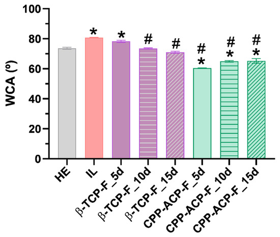 Water contact angle measurements for the enamel surfaces are presented as mean ± SD in Table 3 and are graphically depicted in Figure 6. All enamel surfaces, comparative controls, and experimental treatments exhibited a hydrophilic character (i.e., wettability to water) as indicated by water contact angle (WCA) measurements smaller than 90°. However, differences in wettability were observed among the groups. The healthy enamel surfaces (Group II: HE) showed greater hidrophilicity with a WCA = 73.65°, compared to the lesioned enamel surfaces (Group II: IL) with a WCA of 80.82°. Following treatment with both fluoride compounds, the wettability of the lesioned enamel surfaces increased, reaching WCA values comparable to those of healthy enamel surfaces. After treatment with β-TCP-F, the wettability of the lesioned enamel surfaces showed a gradual reduction, reaching a WCA value of 71.01° after 15 days of treatment. In contrast, the wettability of the lesioned enamel surfaces treated with CPP-ACP-F initially decreased at the first 5 days of treatment (WCA = 60.42°) and gradually increased again over the following days of treatment, reaching a WCA of 65.24° after 15 days of treatment.