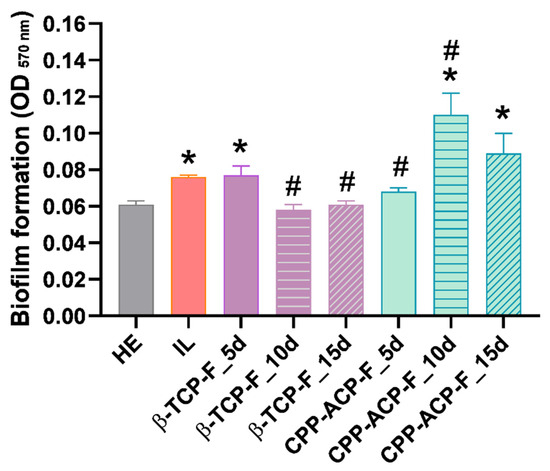 Biofilm formation of S. mutans at 24 h of bacterial culture on dental enamel surfaces after treatment with β-TCP-F or CPP-ACP-F for 5, 10, and 15 days, as measured by the MTT assay. * p < 0.05; any surface vs. Group I: HE (healthy enamel). # p < 0.05 any surface vs. Group II: IL (initial lesion; demineralized enamel).