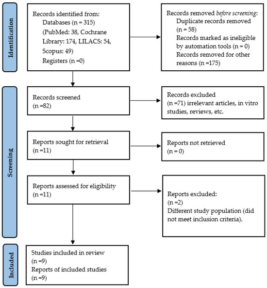 A total of 315 references were identified across the selected databases: 38 from PubMed, 174 from the Cochrane Library, 54 from LILACS, and 49 from Scopus. After removing 58 duplicates and 175 records for other reasons, 82 records were screened based on titles and abstracts. Of these, 71 were excluded due to being irrelevant, in vitro studies, or review articles. The full texts of 11 articles were reviewed, with 2 excluded for not meeting the inclusion criteria due to involving a different study population [20,21]. Ultimately, nine studies were included in the qualitative synthesis and seven in the quantitative synthesis. Figure 1 shows the flowchart that was used to select the studies. Of these, seven articles assessed the effects of probiotics on oral mucositis [22,23,24,25,26,27,28], one evaluated the use of probiotics in oral candidiasis [29], and one examined the effects of probiotics on periodontal disease and plaque index [30]. In addition, one study analysed plaque and saliva samples using high-throughput sequencing [30], two studies assessed stool samples by high-throughput sequencing [23,28], and one study measured oral Candida counts by culture [29].