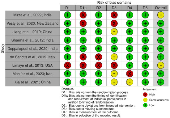 31. McGuinness, L.A.; Higgins, J.P. Risk-of-Bias VISualization (Robvis): An R Package and Shiny Web App for Visualizing Risk-of-Bias Assessments. Res. Syn. Meth. 2020, 12, 55–61. [Google Scholar] [CrossRef]