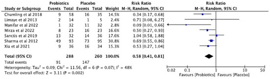 Figure 3. Forest plot of the pooled analysis comparing the incidence of grade 3–4 oral mucositis between probiotic and placebo groups [22,23,24,25,26,27,28]. Each individual study is represented by a square (relative risk) and its 95% confidence interval. The size of the square reflects the weight of the study. The black diamond represents the overall combined effect (RR = 0.58; 95% CI: 0.41–0.81), indicating a significant reduction in risk in the probiotic group.