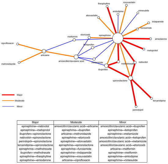 Figure 1 illustrates the top 10 drug-drug interactions (DDIs) identified within our dental patient dataset, extracted from an analysis of 1332 drug pairs tested with the DrugBank Drug Interaction Checker. We ranked the major, moderate, and minor DDIs based on their prevalence in our cohort. To further support the interpretation of these findings, Figure 1 presents a visual drug-drug interaction network, built using Mathematica 13.0, of the top 10 DDIs at each severity level. Each node represents a drug labeled with its name; its size is proportional to its degree (i.e., the number of interactions with other drugs). The links between nodes indicate interaction relationships, with color and line thickness denoting the interaction severity: thick red lines represent major DDIs, medium-thick orange lines indicate moderate DDIs, and thin blue lines correspond to minor DDIs. This network visualization provides an intuitive overview of the most frequently interacting drugs and their foremost roles in dental care’s DDI landscape. Our findings highlight the frequency and variety of DDIs in dental practice and offer critical insights into the most common DDIs in this medical field.
