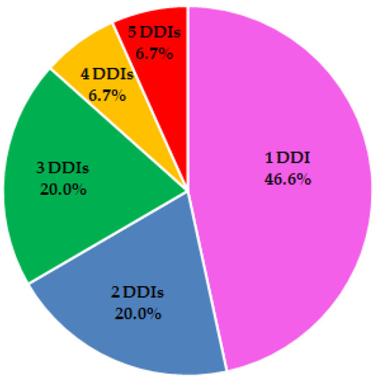 Furthermore, Figure 2 illustrates that the 31 major DDIs identified affect 15 patients, with our analysis revealing that 46.6% of these patients experience one DDI, 20.0% have two DDIs, 20.0% have three DDIs, 6.7% have four DDIs, and 6.7% exhibit five major DDIs.