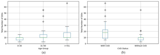 The Kruskal-Wallis test showed a significant difference in total DDI counts across age groups, with H(2) = 7.81, p = 0.0202; Figure 3a presents the boxplot of the total DDIs count by age group. While the median total DDIs counts remained consistent across age groups, the Kruskal–Wallis test revealed a significant difference in distributions, with older adults exhibiting broader interquartile ranges. Furthermore, the Mann–Whitney U test indicated a significant difference in total DDIs counts between patients with and without CVD (U = 490, p = 0.0033); Figure 3b presents a boxplot comparing the total DDIs count between patients with and without CVD, demonstrating a higher burden of DDIs in patients with CVD.