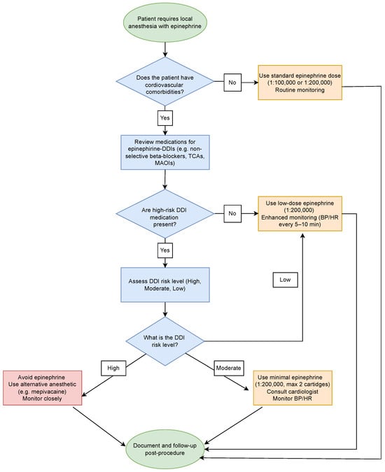 To manage epinephrine DDIs, we propose a decision flowchart presented in Figure 4. The algorithm guides clinicians through a stepwise evaluation of cardiovascular comorbidities and drug therapies to determine the epinephrine dosing strategy. Risk levels are stratified based on known epinephrine-DDIs—e.g., with beta-blockers, tricyclic antidepressants (TCAs), MAO inhibitors (MAOIs)—, with tailored recommendations for standard, low-dose/minimal epinephrine use or complete avoidance in high-risk cases. The flowchart emphasizes enhanced monitoring, consultation when needed, and documentation of all decisions post-procedure.