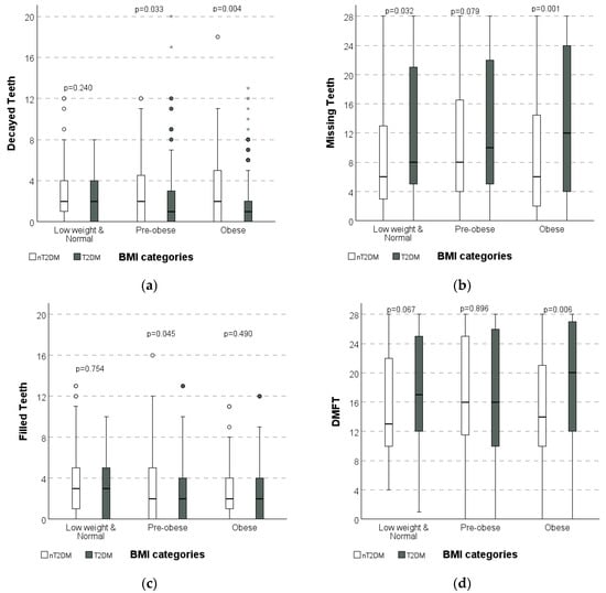- Hamasha, A.A.; Alsolaihim, A.A.; Alturki, H.A.; Alaskar, L.A.; Alshunaiber, R.A.; Aldebasi, W.T. The relationship between body mass index and oral health status among Saudi adults: A cross-sectional study. Community Dent. Health 2019, 36, 217–222. [Google Scholar]