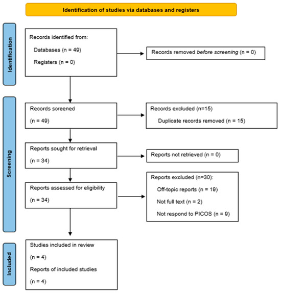 Due to their duplication, 15 articles were removed. Then, 34 articles were assessed for eligibility. Of these, 30 were excluded because 19 were off-topic, the full text was unavailable for 2, and 9 did not meet the PICOS criteria. The large number of excluded studies mainly reflects the limited relevance of many articles to the specific field of OMFS, the absence of original data, and the strict application of PICOS criteria. Additionally, the recent introduction of LLM-based chatbots (since late 2022) means that only a few primary studies have been published to date. Consequently, four articles were included in this revision, as illustrated by the PRISMA 2020 flowchart (Figure 1 and Table 2). The four articles that met the inclusion criteria, all were published in 2024; in total, 2/4 (50%) articles assessed how effectively these chatbots performed in answering patients’ inquiries about OMFS and 2/4 (50%) articles evaluated ChatGPT’s reliability and accuracy in responding to general dentists’ questions about OMFS. No articles from 2025 were included because, as of 8 April 2025, no publications meeting our defined PICOS criteria had been identified.