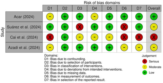Overall, the studies were judged as follows: serious risk of bias for Cai et al. 2024, moderate risk for Acar and Suárez et al.’s studies [21,22], and low risk for Azadi et al. 2024 [25].